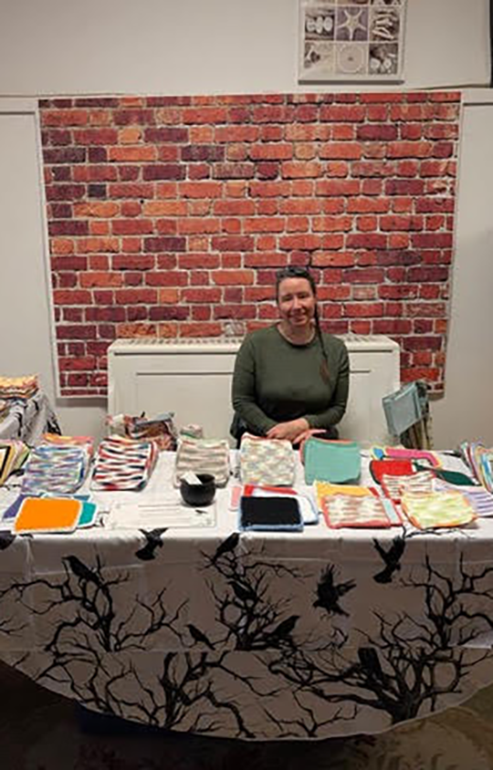 Crocheted Cotton Pot Holders, Cotton Cloths, and Acrylic Scarves.